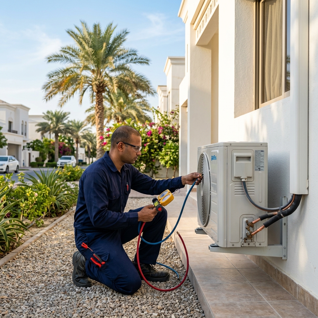 "My O General AC stopped working at 2pm on a Friday. I WhatsApp'd Ibrahim AC and their technician was at my villa in Al Rawda 2 in under 25 minutes. Gas refill and a new capacitor โ done in one hour. Amazing service."